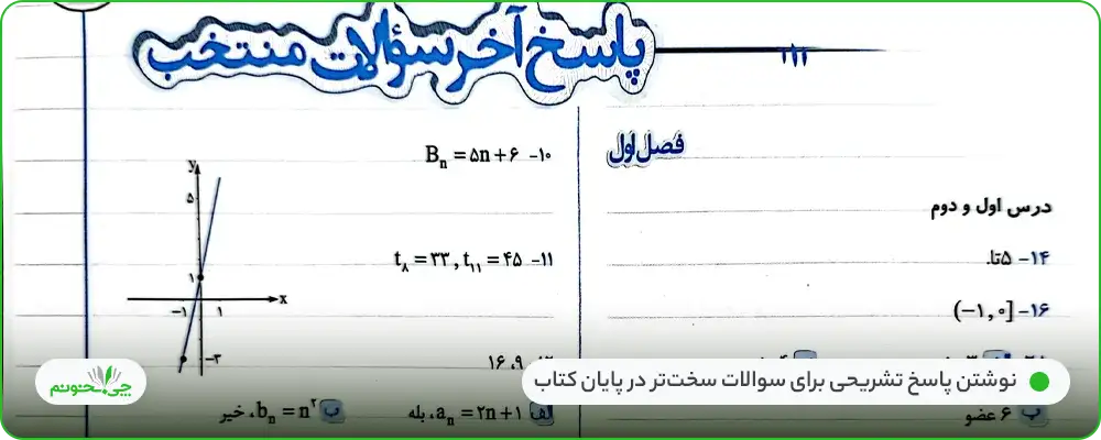 در پایان درسنامهها، سوالات تشریحی مربوط به هر بخش آموزشی، نوشته شده است. در این بخش، سوالات به ترتیب آموزشهای درسنامه و کتاب درسی و با در نظر گرفتن افزایش سطح تدریجی سوالات از ساده به سخت، چیده شدهاند تا دانشآموزان به تدریج در حل سوالات، ماهرتر شوند. در طرح سوالات، چارچوبهای کتاب درسی و امتحانات، در نظر گرفته شدهاند.