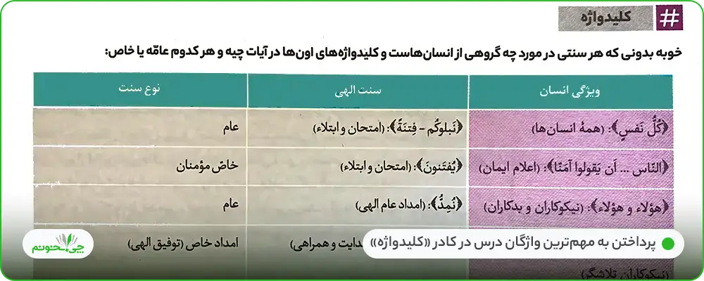 در پایان درسنامه هر درس، برای جمعبندی نکات و مطالب آموزشی آن، سه بخشِ «تعریف اصطلاحات و مفاهیم کلیدی» مهم آموزش داده شده در متن هر درس، «مرور درس با سوالات جای خالی» و نمودارهایی تحت عنوان «درس در یک نگاه»، قرار گرفته است. این سه بخش میتوانند در پایان مطالعه درسنامه و برای تثبیت مطالب در ذهن، مورد استفاده قرار گیرند.