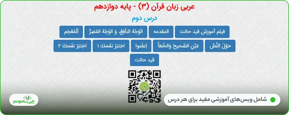 در ابتدا و انتهای هر فایل صوتی هم از آهنگهای کوتاه عربی استفاده شده و به جذابیت گوش دادن به آنها میافزاید. برای دسترسی به این ویدیوها و ویسها باید به کیوآرکد ابتدای هر درس، سر بزنید.