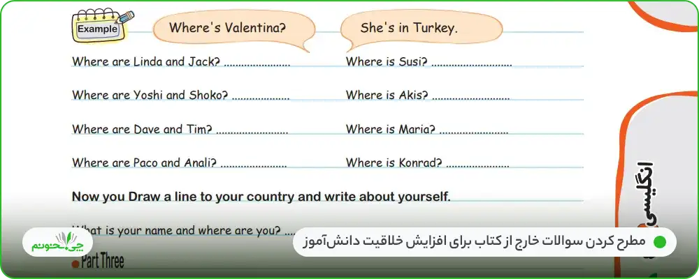 سوالات این کتاب، برای هر درس، به سه تایپ سوالی شنیداری (Listening)، خواندن و نوشتن (Reading And Writing) و گفتاری (Speaking) تقسیم و برای هر بخش، سوالات اختصاصی، طراحی شده است.